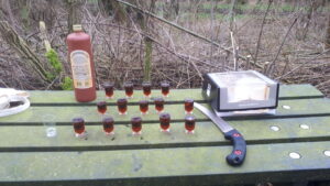 De voorbereidingen voor de opbouw van de nieuwe eendenkooi in Capelle vorderen goed. Onze werkgroep neemt een moment van rust na een ochtend met zwaar werk in de drassige bodem.
