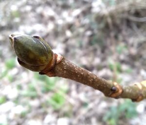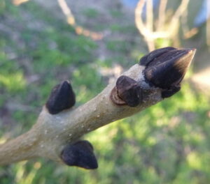 In het parkje Buitenhof kwamen we de winterakoniet met zijn gele bloemen tegen. Paardenkastanjes lieten hun kleverige knoppen zien en de Kaukasische vleugelnoot zijn opschot van takken.