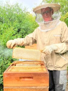 De bijen zijn nu in goede handen bij zijn vrouw Joke, die het imkeren van hem heeft geleerd.
