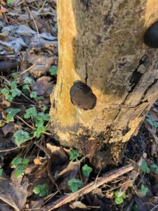 Op een modderige Tanthofkade zagen we de zwarte knoppen van de es en de groene van de esdoorn. Ook was de meidoorn te herkennen. Kogelhoutskoolzwammen, elfenbankjes en judasoren vertoonden zich ook.