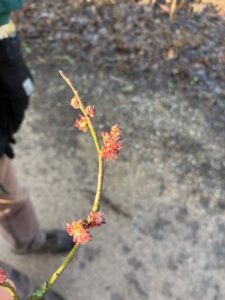 In het parkje Buitenhof kwamen we de winterakoniet tegen. Paardenkastanjes lieten hun kleverige knoppen zien en de kaukasische vleugelnoot zijn opschot van takken.