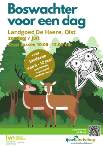 Hou jij van buiten zijn en van het bos? Wil jij ook wel eens weten wat een boswachter kan en doet? Kom dan op zondag 7 juli naar landgoed de Haere tussen Deventer en Olst. IVN Deventer/Olst-Wijhe en IJssellandschap organiseren dan de cursus Boswachter voor een dag!