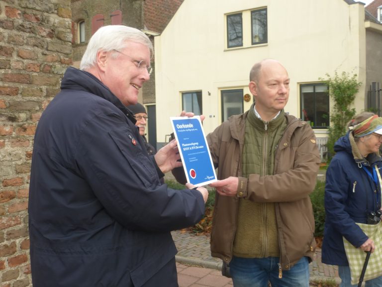 Gerrit mocht als prijswinnaar een kleine wandeling door Deventer doen met de commissaris, een medewerker van de provincie Overijssel en van IVN Overijssel en een aantal leden van de plantenwerkgroep. De uitreiking van de oorkonde vond plaats bij de oude stadsmuur van Deventer (vlak bij Mimik), daar waar de Muurbloem in 2012 uitgezet is en nog steeds aanwezig is.