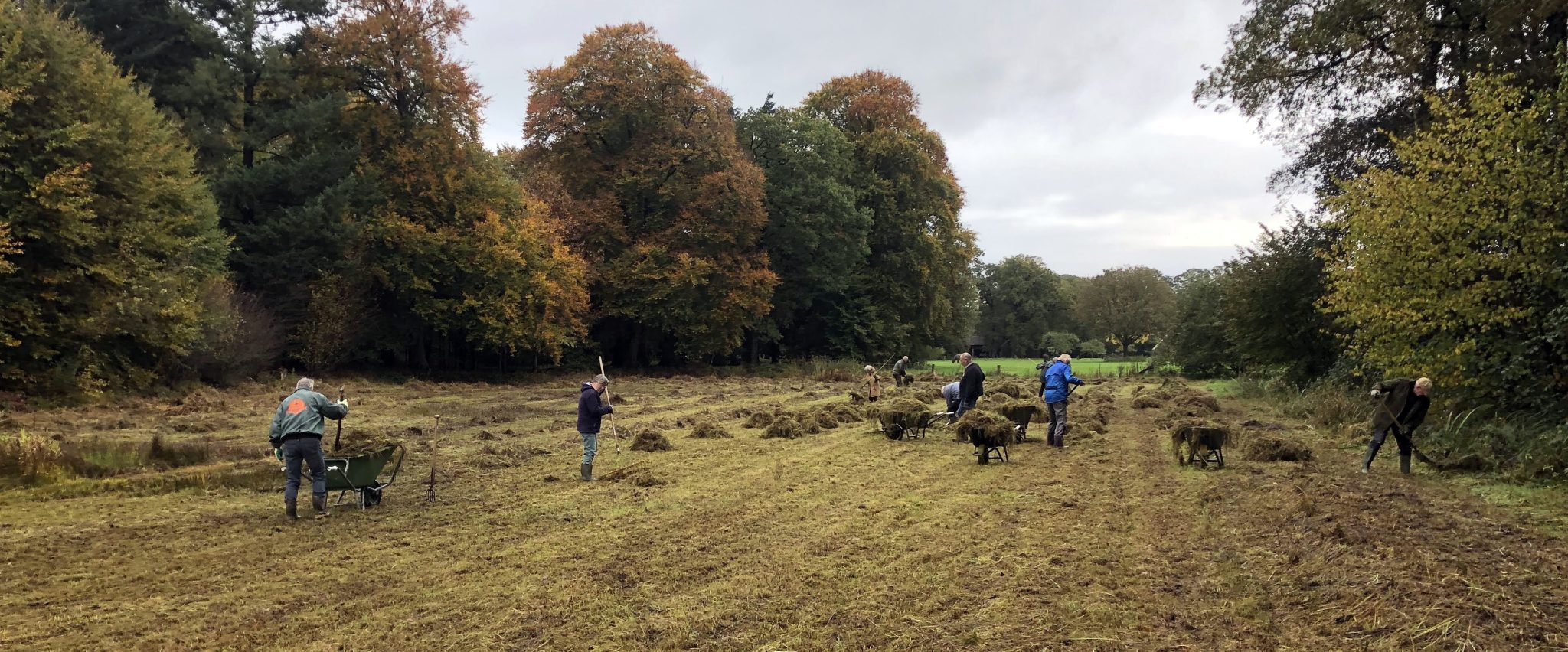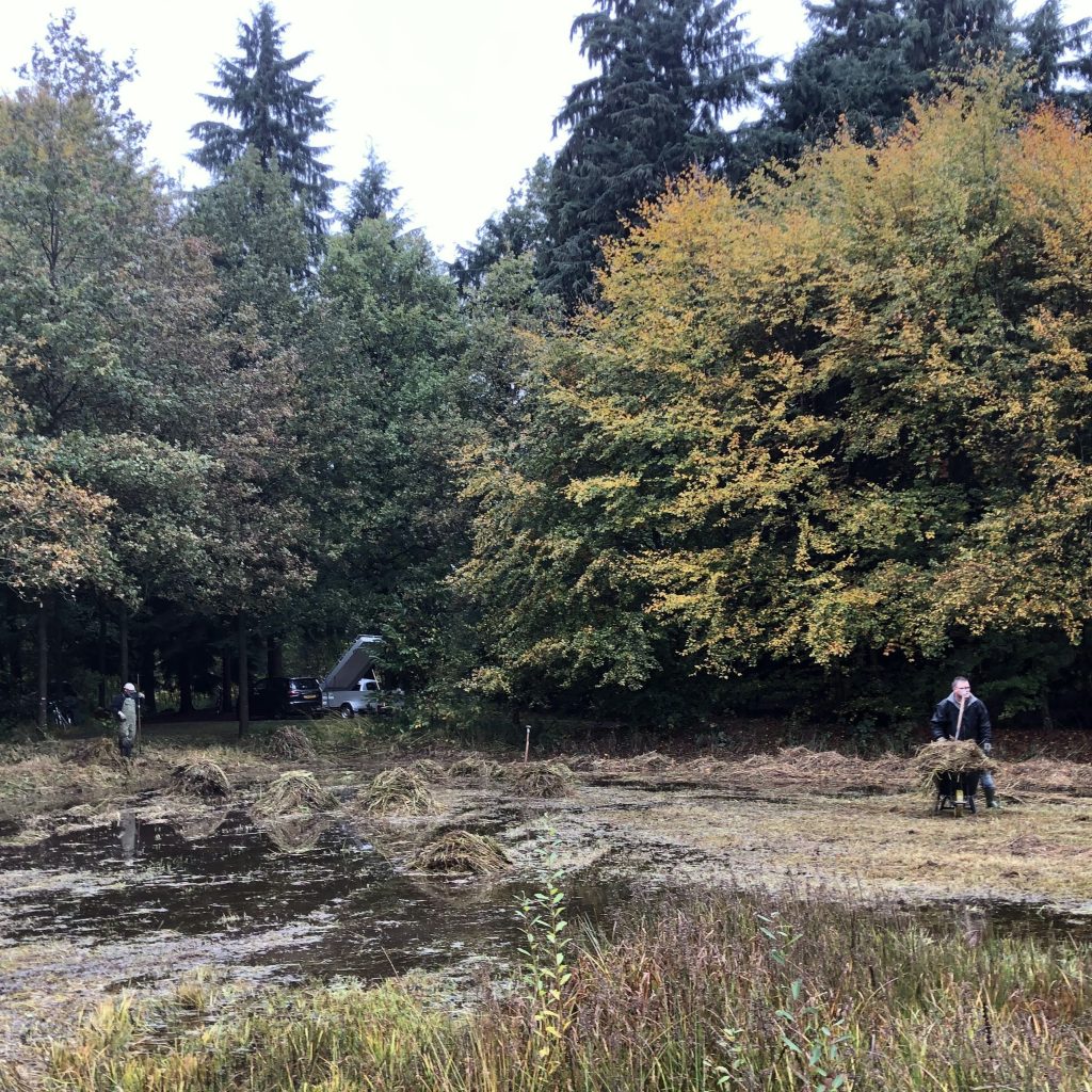 De weersomstandigheden waren best goed. De bodemgesteldheid was minder. Jan Boink was er met veel pijn en moeite in geslaagd het vennetje op de meeste plaatsen uit te maaien, maar drassig was maar een zwakke afspiegeling van wat werkelijk de toestand van de bodem was. Hier en daar stond zoveel water, dat er niet te maaien viel. De kruiers hadden op deze zaterdag ook niet gemakkelijk, maar met een man of tien werd er toch redelijk opgeschoten, al kwam niet alles af. Op de foto’s, ook van Jan Boink, onze ploeterende vrijwilligers. Mooi dat ze weer present waren.