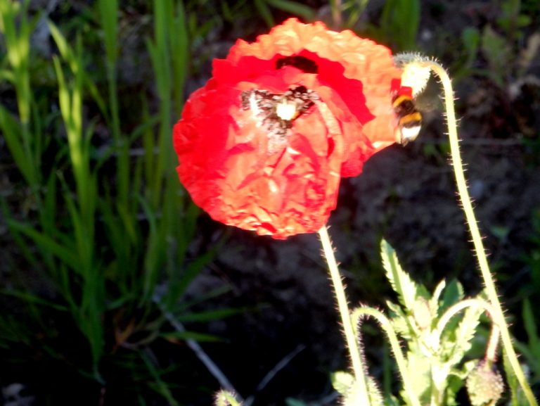 Bij windkracht 3 uit het noordoosten staat de Klaproos rustig heen en weer te wiegen. Voor de toeschouwer een aandoenlijk tafereel. Voor de fotograaf een onmogelijkheid om een en ander scherp te stellen. De aanwezigheid van de Aardhommel op dit vroege tijdstip van de dag maakt echter veel goed.