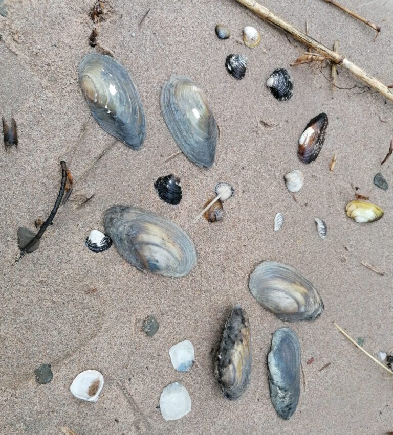 Mooi of minder mooi strandweer: er is langs de Nieuwe Merwede altijd wel iets interessants te vinden: krabbetjes, soms een rivierkreeftje, veel aangespoelde zoetwaterschelpen, sporen van de bever.