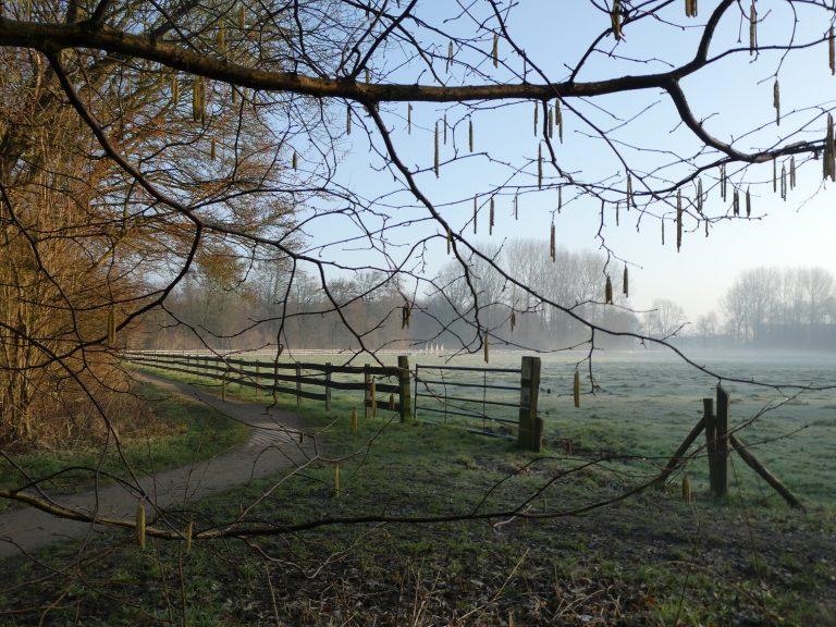 Tijdens onze wandeling zien we al veel bomen uitlopen. Natuurlijk zijn er de eerste voorzichtige blaadjes van de vlier en de gele katjes, zo wordt de bloeiwijze genoemd van de hazelaar en de els. Het lijkt erop dat de zachte winter de ontwikkeling heeft versneld, waardoor het pollenseizoen ook vroeg is gestart.