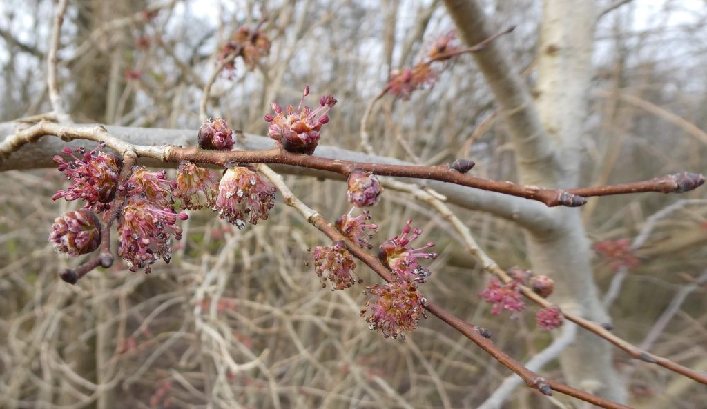Een bijzonder bloei die we tegenkomen is die van de iep. Aan de iep is veel te beleven. Dat begint al heel vroeg, in februari, als de meeste bomen nog vast in winterslaap zijn. Plots is er een roze/rode kleurwaas over de iep, de bloemknoppen gaan open. De bloemen zitten in toefen (ook wel tuilen) bij elkaar op heel korte stelen. Wie goed kijkt ziet de stempels en meeldraden met helmknoppen zitten (zie foto). De bladeren komen pas tevoorschijn als de bloei al een behoorlijk eind op streek is.