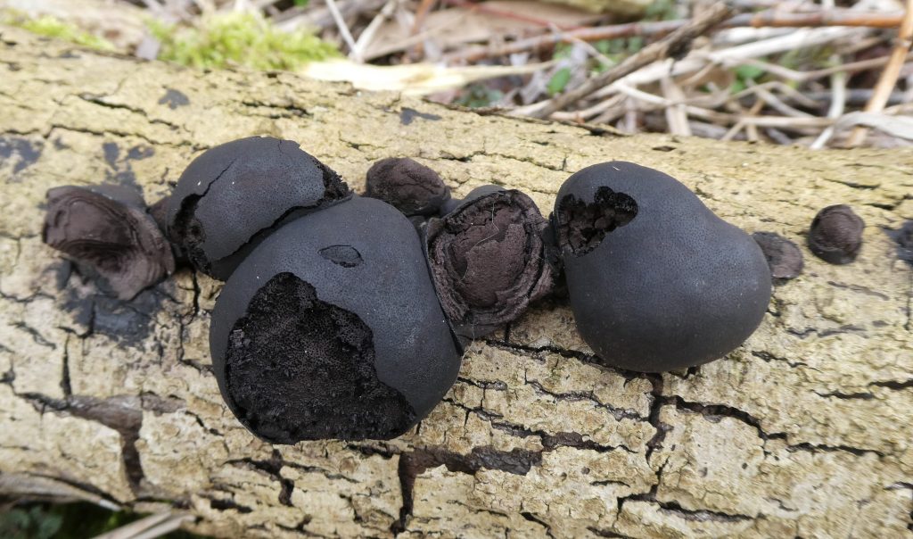 de kogelhoutskoolzwam. Hij komt vooral voor in een voedselrijke bodem. Deze zwam verschijnt eerst in de vorm van donkerbruine kogels. Later worden de vruchtlichamen zwart en hard. Ze kunnen een doorsnee krijgen van 2-6 cm.
