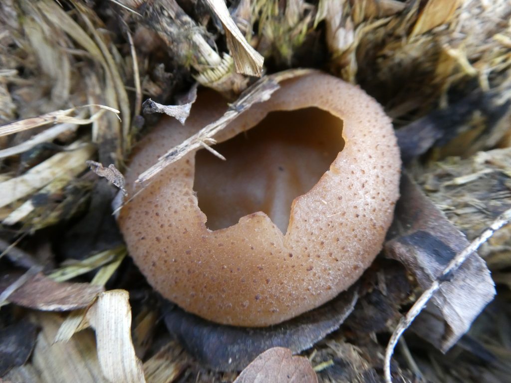 Heel bijzonder zijn de paddenstoelen die op de broeihoop groeien. We ontdekken de vroege bekerzwam en de kogelhoutskoolzwam (zie foto’s). De vroege bekerzwam doet zijn naam eer aan door nu al de kop boven de mesthoop uit te steken. De vroege bekerzwam helpt om de hoop om te zetten naar compost.Ze beginnen als kleine gele bolletjes en kunnen uiteindelijk wel 10 cm in doorsnee worden. Op een dode tak zien we