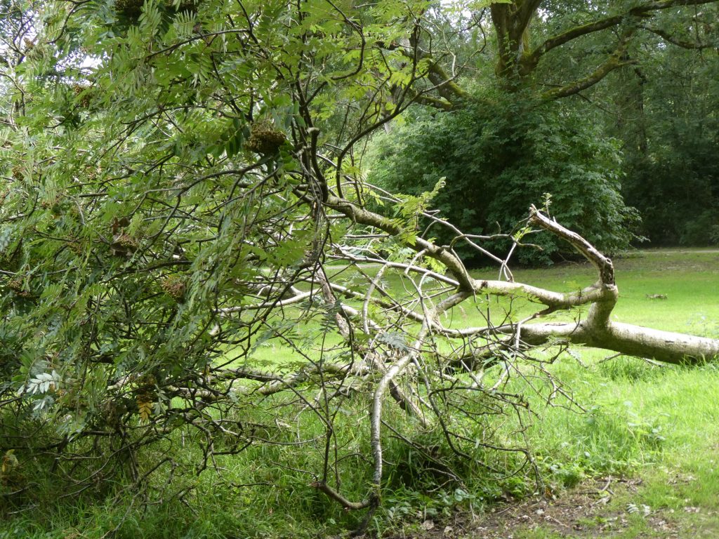 Ook in het Wisentbos hebben een aantal prachtige bomen het loodje gelegd. Bij de open plek bij de vijver had de storm vrij spel met als gevolg dat de paardenkastanje gesneuveld is. Wanneer je iets verder naar boven loopt zie je een lijsterbes liggen en in het bosje even verder (richting de brug) liggen een aantal populieren omver. Zie de foto’s.