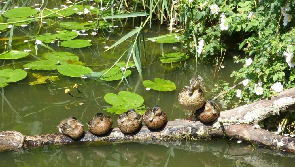 In de Lage Vaart en de Wisenttocht zie je het hele jaar door de wilde eend. Zowel het mannetje (met de glanzende groene kop en de witte nek ring), als het vrouwtje (onopvallend bruin). En toch ….. is er sprake van een mysterieuze terugval van de wilde eend. Ons land telt weliswaar nog steeds zo’n 200.000 tot 300.000 broedparen, maar sinds de jaren ’90 is het aantal broedparen met zo’n 30% achteruitgegaan. Waterverontreiniging en gifstoffen hebben de hoeveelheid insecten enorm doen dalen. Een belangrijk gegeven; immers eendenkuikens groeien op waterinsecten. Een voorbeeld hoe het in een voedselketen fout gaat. Die wilde eend, die doodgewone wilde eend moet vooral doodgewoon blijven. Lekker in het voorjaarszonnetje met z’n allen (zie foto). Allesbehalve doodgewoon zijn deze vreemde kostgangers: exotisch ogende schildpadden midden in het Wisentbos. Deze drie exemplaren (zie foto) zag ik bij het houten bruggetje parallel aan de Lage Vaart. In Nederland komen van nature geen zoetwaterschildpadden voor. Ze zijn gedumpt door mensen die ze als huisdier hielden.