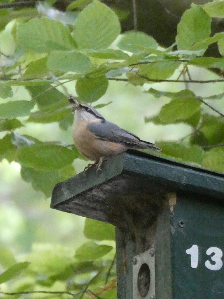 Op dinsdag 16 mei heb ik een afspraak met voormalig boswachter Lykele Zwanenburg in het Wisentbos. In deze periode van het jaar controleert Lykele zo’n 3 tot 4 keer de nestkastjes die in het bos zijn opgehangen om te zien of de nestkasten ‘bezet’ zijn. De beste tijd om dit te doen is ‘s morgens vroeg. We treffen elkaar om 8.30 uur. Na een nacht met regen hebben de vogels er weer zin in. Het gezang komt je tegemoet en ik krijg meteen ‘zangles’, de zwartkop met zijn heldere, hoge tonen, het winterkoninkje met z’n wekkertje (trillers), de tjiftjaf met z’n tjun, tjin, tjun, tjin en de koolmees met het geluid dat lijkt op een fietspomp. Na enige oefening kan ik ze uit elkaar houden en herken ik de vogels aan hun zangkunsten.