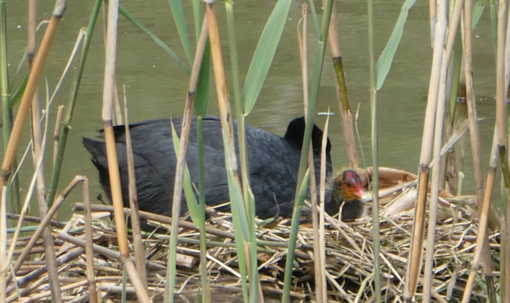 De meerkoeten hebben hun best gedaan. In de vijver tel ik naast de ouders vijf jonge koeten. Jonge meerkoeten hebben grappige koppies: een rode snavel en kale, rode huid met knobbeltjes, omgeven door een krans van oranje gele slierten.