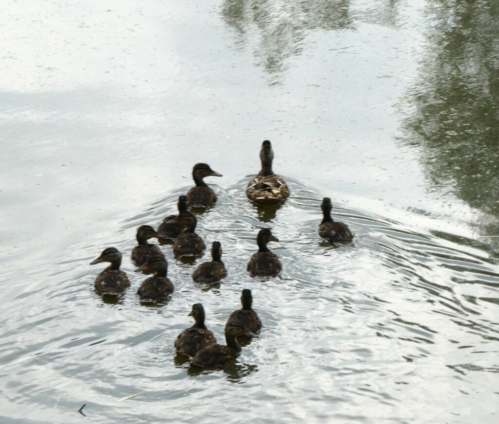 Wel zie ik een vrouwtje van de wilde eend met haar jongen. Die begint vaak met zo’n twaalf jongen, een aantal dat zo hoog is omdat er veel van verloren gaan. Ze zijn nu nog alle 12 in leven (zie foto). Vaak worden er ook maar een of twee van die eendjes volwassen.