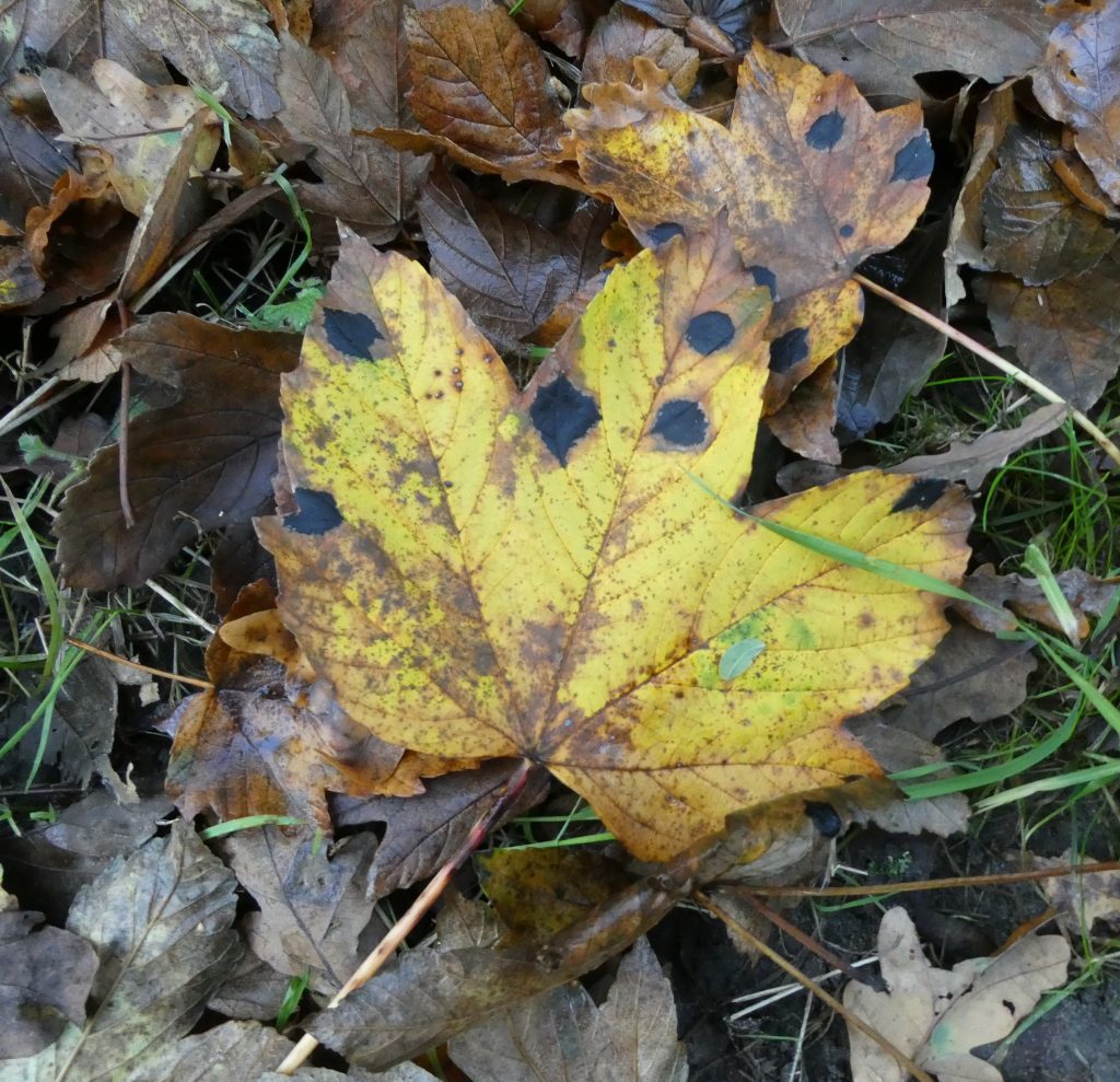 Bij de esdoorn aan de Wisenttocht zijn talloze bladeren aangetast met massa’s donkere vlekken. Het lijken inderdaad wel inktvlekken. Het lukt niet zo’n vlek met je vinger weg te vegen. De vlek zit ook aan de onderkant van het blad. De aantasting is zo erg dat de boom een deel van het blad al laten vallen, omdat ze geen nut meer hebben.