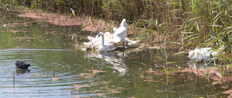 Op onze eerste stop bij de plassen achter het vakantiepark Europarcs trok de mist op. We zagen op het gladde wateroppervlak de weerspiegeling van de vogels bijna in tweevoud. Een prachtig gezicht!