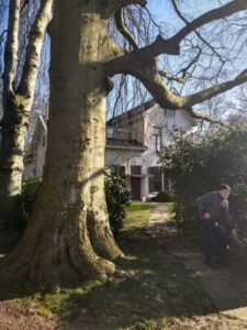 Opmerking van de inspecteur: De conditie van de beuk lijkt wat verminderd, maar de boom blijft toch behoorlijk goed in leven na de brand van 2022. De gaten die zijn geboord om de hitte af te voeren zijn inmiddels aanvoer dichtgroeien. Dat is een goed teken.