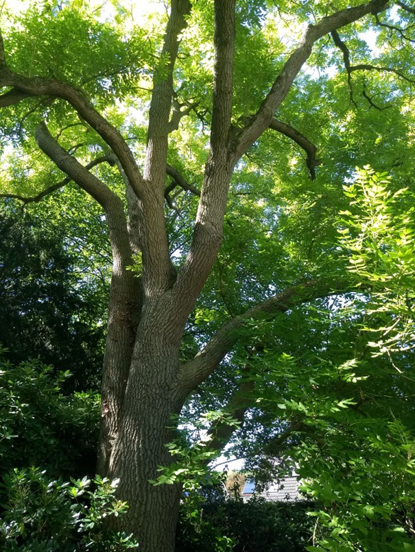 Opmerking van de inspecteur: De vertakkingen vanuit de hoofdstam ontspringen met een scherpe hoek. Mogelijk in de toekomst een kroonverankering inbrengen om het geheel te verstevigen. Bij volgende controle de aanhechtingen van de takken goed inspecteren.