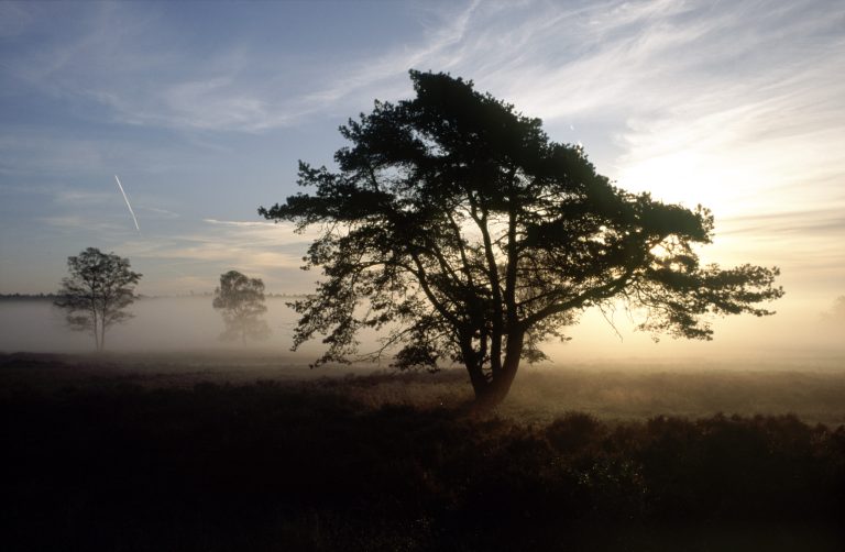 Silhouet van een boom bij zonsopgang met nevel op een open veld en een streep in de lucht.