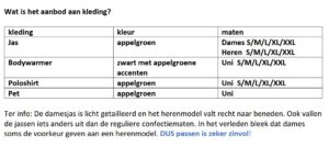 Hieronder de kleding en de tabel met maatvoering.