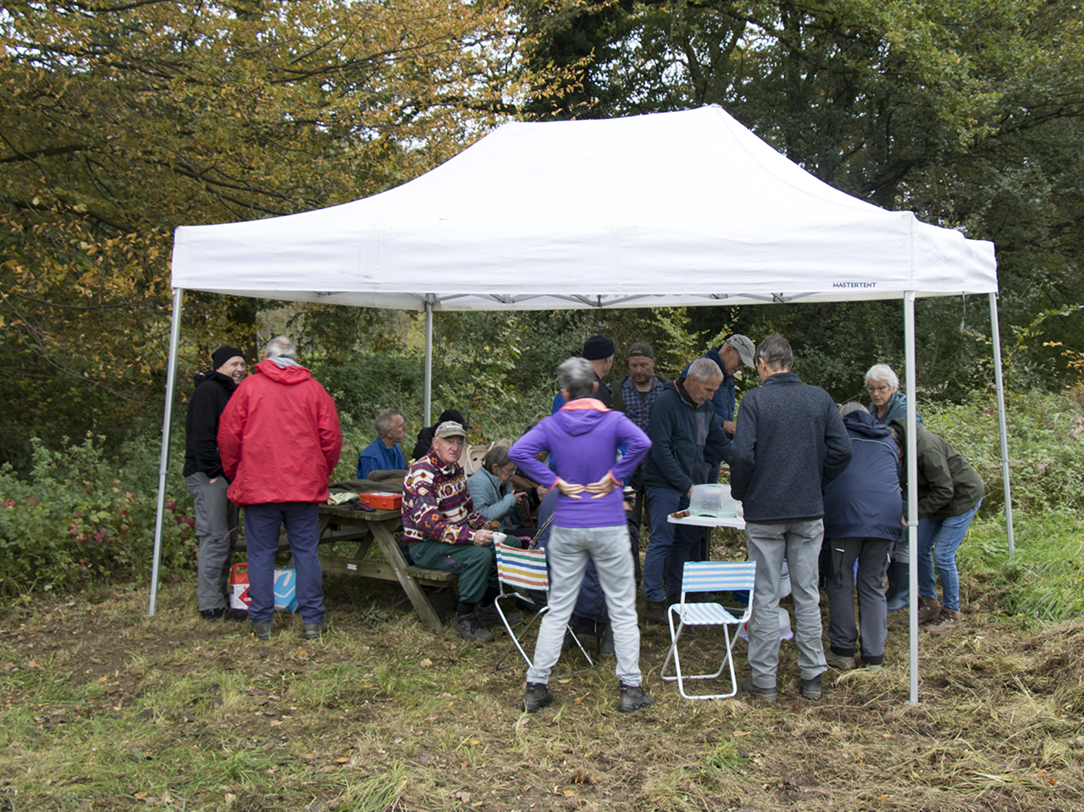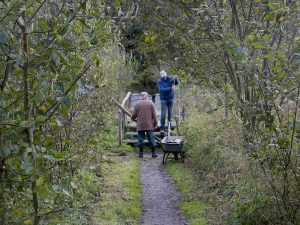 Hoewel de weersvoorspelling er niet al te gunstig uitzag en de voorbije dagen het bos behoorlijk drassig was geworden door de vele regen, hebben op de nationale natuurwerkdag op 4 november 17 stoere ivn vrijwilligers van Elsloo, onder auspiciën van Staatsbosbeheer, hard gewerkt om overtollig groen te snoeien, paden weer begaanbaar te maken, vlonder gerepareerd en de afwateringsbuis onder de weg naar Geulle weer opengemaakt. Deze was versperd omdat iemand een pvc plaat voor de doorgang had gezet. Het was dus niet de bever die voor overlast zorgde. Nu is het afwachten tot het water zakt, zodat het pad weer goed begaanbaar is. Ga maar eens kijken naar de metamorfose die het Elsloose bos plaatselijk heeft ondergaan door onze ivn-ers.