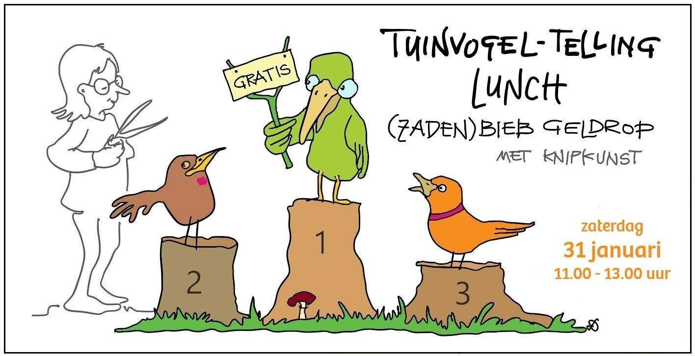 Een knipkunstenaar van de Nederlandse Vereniging voor Papierknipkunst gaat vanaf 12.00 uur met iedereen die wil vogels knippen. We vertrekken met zijn allen op tijd naar huis met een telplaat én een zakje met zaadjes voor het kweken van planten in jouw tuin waar veel vogels op afkomen. Op naar een landelijk record vogelstellen in eigen tuin? Dus: neem je vriend, vriendin, moeder, vader, oma, opa mee naar de bieb! Aanmelden kan via Nationale Tuinvogeltelling Lunch – Geldrop | zaterdag 31 januari 2026 | Bibliotheek Dommeldal