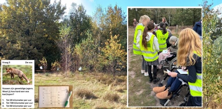 Want na een klein half uur arriveerde de groep op een open ruimte in het bos waar voor hen, voor jong en oud samen, het ‘Zweeds renspel’ in de bomen en struiken was opgehangen. 15 kaarten met multiple choice vragen over onderwerpen uit de natuur. De vragen moesten gezamenlijk, in een team van een bewoner van Berkenheuvel en een leerling van de Dommeldalschool, beantwoord worden.