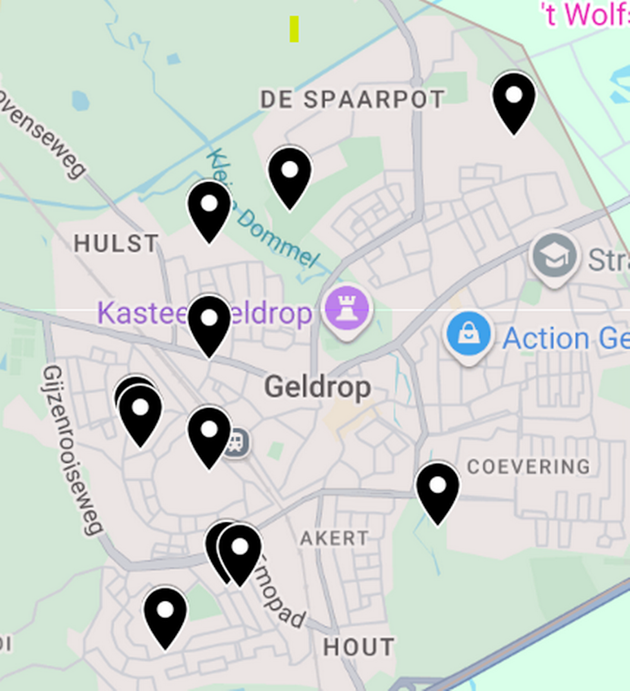 Op dit kaartje zie je de locaties in Geldrop van de 11 secundaire nesten gevonden in 2025. De nesten zijn niet geruimd en hebben, ieder, gemiddeld 350 bevruchte koninginnen voortgebracht. De koninginnen overwinteren in de buurt van het oude nest. Gezien dat 10% daarvan de winter overleeft, zullen er meer nesten in 2026 zijn. Met een groeifactor van 5 tot 7, zijn ongeveer 66 nieuwe kolonies te verwachten dit jaar. Het is niet voor niets een invasieve exoot genoemd.