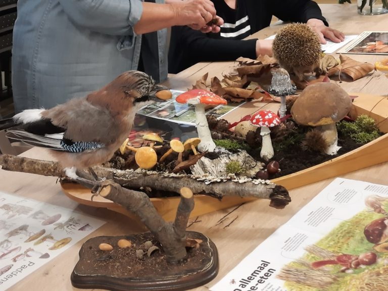Donderdagmiddag 23 november hadden we met de complete werkgroep een afspraak bij woonzorggroep Hooge Heide. Daar stonden 3 tafels voor ons klaar en die hebben we aangekleed met allerlei materialen rond de thema’s (vergeten) groentes en moestuin – herfst in het bos – voedsel voor dieren en hun gedrag. Alle cliënten maakten kennis met de 3 onderwerpen want wij schoven met al onze spullen door van tafel naar tafel.
