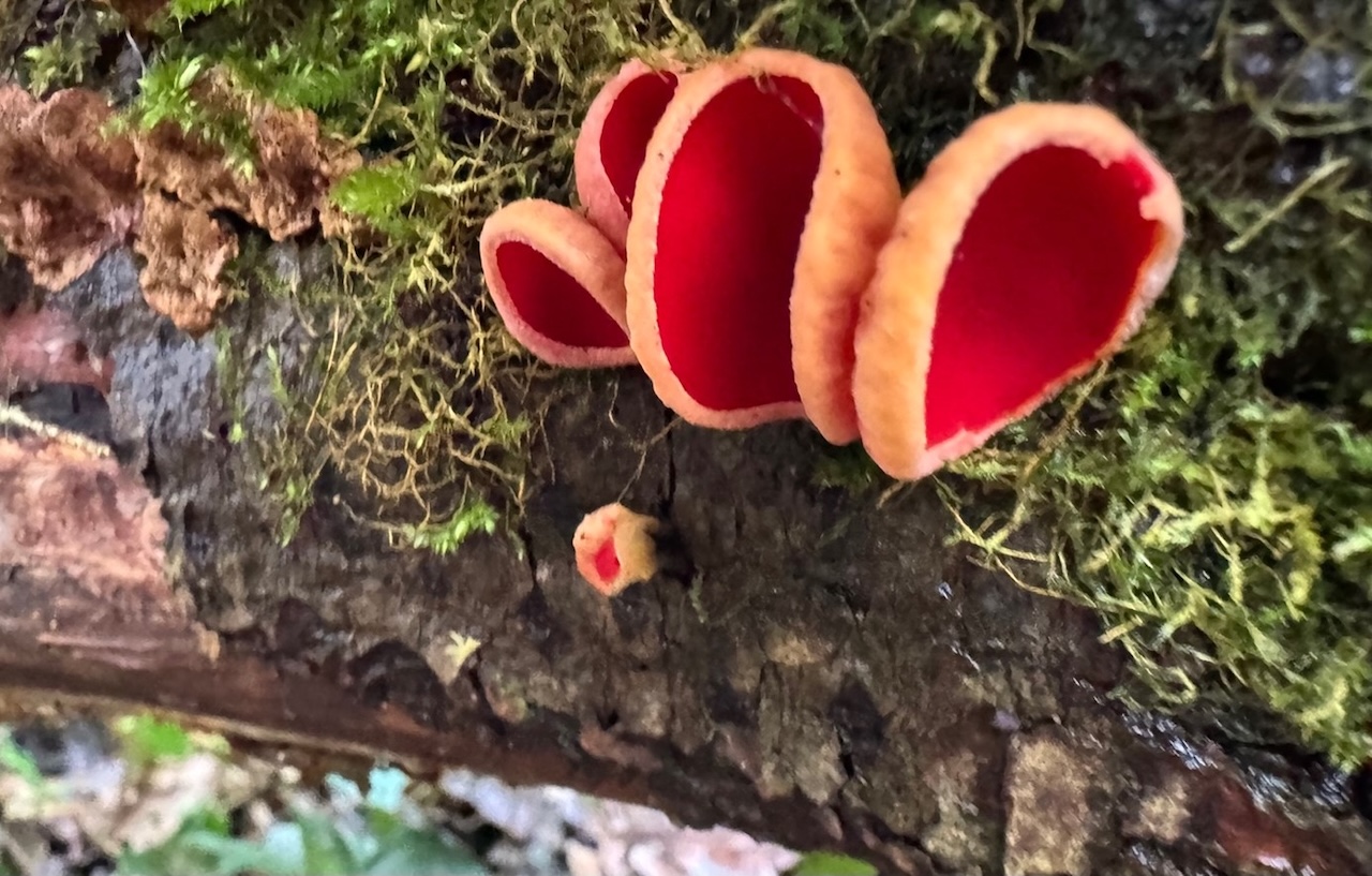 Een van de eerste en meest opvallende winterpaddenstoelen is de Rode Kelkzwam. Deze paddenstoel trotseert moeiteloos kou en vorst en verschijnt elk jaar rond januari – soms zelfs al in december. Hij groeit op half begraven, dood hout, bij voorkeur op zachthout zoals populier of wilg, en geeft de voorkeur aan een vochtige omgeving. Aan die natte omstandigheden is deze winter geen gebrek.