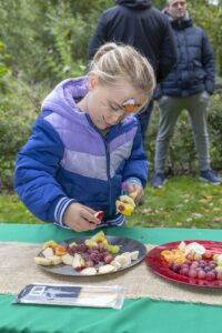 De ontvangstvrijwilligers maakten de mensen wegwijs en via het voedselbos, waar de kinderen een fotobingo konden doen met als beloning een lekkere zelfgemaakte fruitspies, liepen de mensen naar het IVN-plein. Hier was het gezellig: de koffie en thee vonden gretig aftrek (lekker warm!) en de kinderen werden door twee oud-jeugdleden prachtig geschminkt.