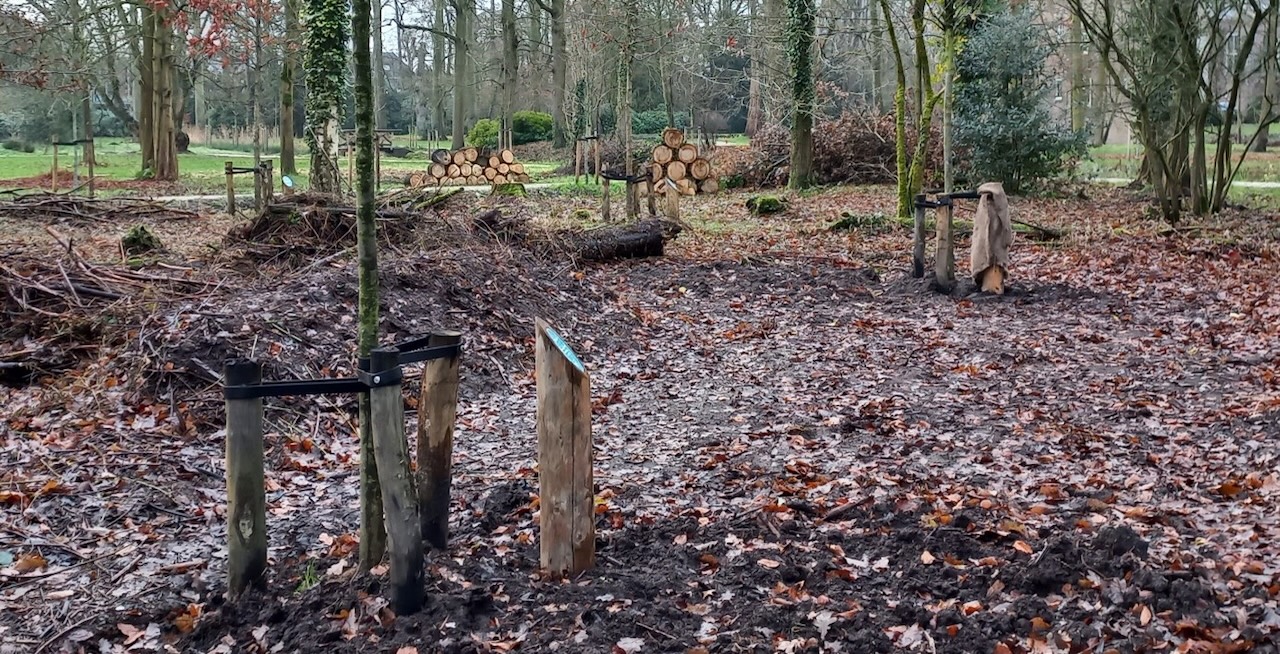 Een stukje verder wachtte een verrassing. Het was al bekend dat op een klein gebied van het landgoed het zogenaamde 100-jarigen bosje ligt. Voor mensen die hun 100ste verjaardag vierden, werd hier een boom geplant met een naambordje. Deze bomen waren echter nooit te zien omdat alles overgroeid was met struiken. Maar nu is het hele gebied geruimd en zijn ook de naampaaltjes goed zichtbaar. De laatste boom is geplant op 18 november van dit jaar maar er staat ook nog een paaltje met een jute zak erover. Dus waarschijnlijk mogen we binnen de gemeente op korte termijn nog een 100-jarige inwoner verwelkomen.