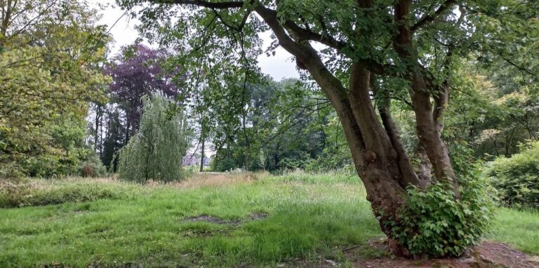 De wandeling startte bij de sequoiadendron, de mammoetboom, om verder te gaan naar de twee gigantische platanen. Een vervolg langs de kenmerkende treurbeuk met haar afleggers, de treurende takken die in de grond opnieuw zijn uitgeschoten, was helaas niet mogelijk. Het pad was gewoon te slecht.