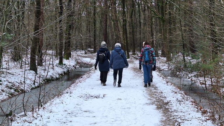 We zien een paar zwarte kraaien en horen de groene specht. De stammen van verschillende dennensoorten (onder andere de Grove den en Zeeden) komen nu prachtig uit tegen de witte achtergrond. Op een omgevallen boomstam vlakbij het ‘Venneke’ vinden we dat het ‘koffietijd’ is. Voor Trees is het overigens altijd koffietijd!