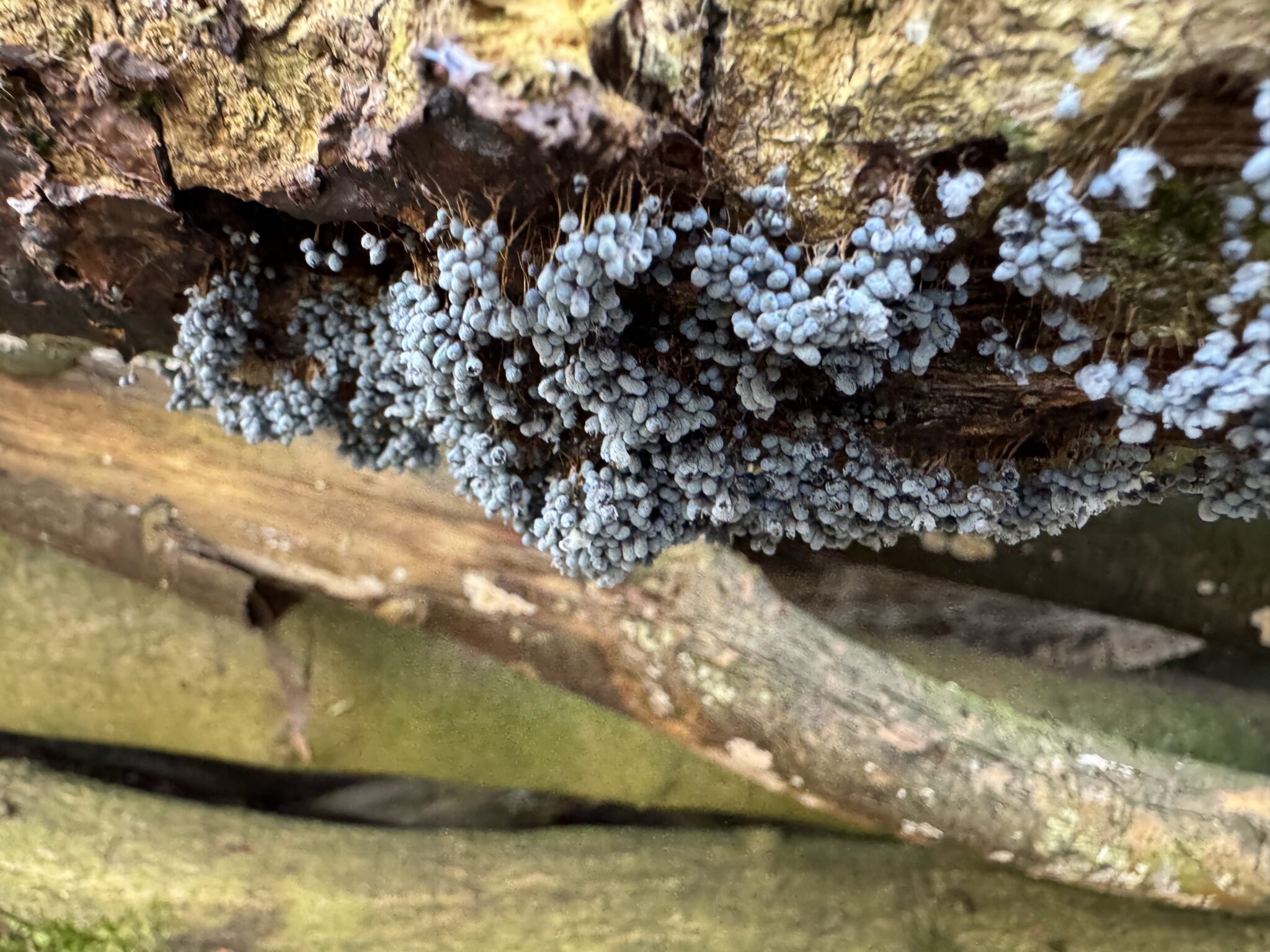 Een andere bijzondere vondst – ook in het voedselbos – was het Troskalknetje. Niet speciaal zeldzaam, maar wel leuk om te zien. Het is een slijmzwam. Ze vormen geen schimmeldraden, maar groeien op het substraat. Een ander bekend lid van de slijmzwammen familie is de felgele Heksenboter. Het Troskalknetje groeit aan de onderkant van vrij liggende stammen of takken. Daar vormen ze als het ware trosjes. Jonge exemplaren zijn oranje, later kleuren ze blauwgrijs. Elk afzonderlijk vruchtlichaam is ongeveer 1 millimeter, maar omdat ze met veel bij elkaar staan toch gemakkelijk te vinden. Je moet wel aan de onderkant van de takken kijken. Deze vondst staat bijna aan het eind van de houtstapel rechts.