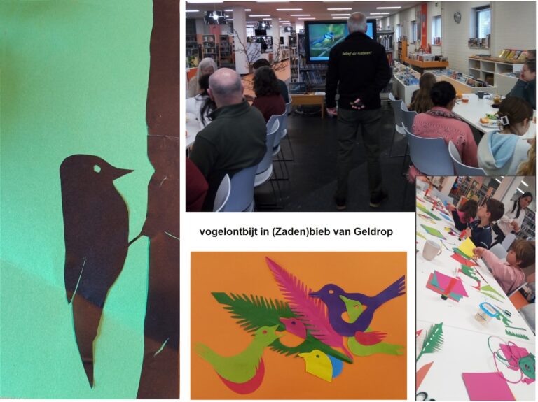Het laatste weekend van de maand januari was het Nationale Tuinvogeltelling. In de (zaden)bibliotheek aan de Heuvel in Geldrop was voor het tweede jaar een ontbijt met informatie over tuinvogels, gevolgd door een ludieke component. ‘Onze Dorus’ spijkerde de vogelkennis van de aanwezigen bij, waarna we met tweekleurig papier vogels en veren gingen knippen. Het was wederom een succes!