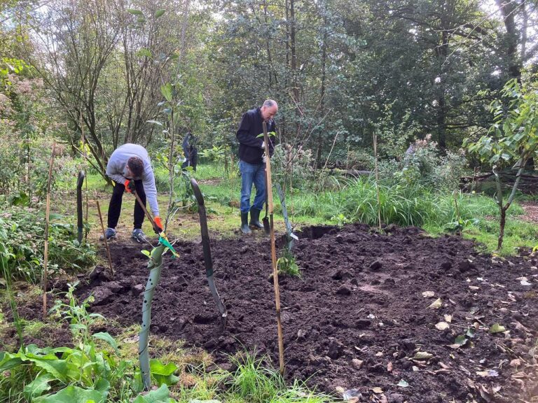 Wij zijn blij met het resultaat! zo komen we steeds verder met de uitvoering van de plannen. In het midden van het lage gedeelte, wat het hoogste ligt, is een stuk omgespit van 5 bij 10 meter. Dit stuk gaan we inzaaien met zaaigoed van de Cruydt-Hoeck voor de diversiteit ten behoeve van de insecten en de vlinders. De ril in het lage gedeelte die behoorlijk was ingezakt is weer prachtig aangevuld.