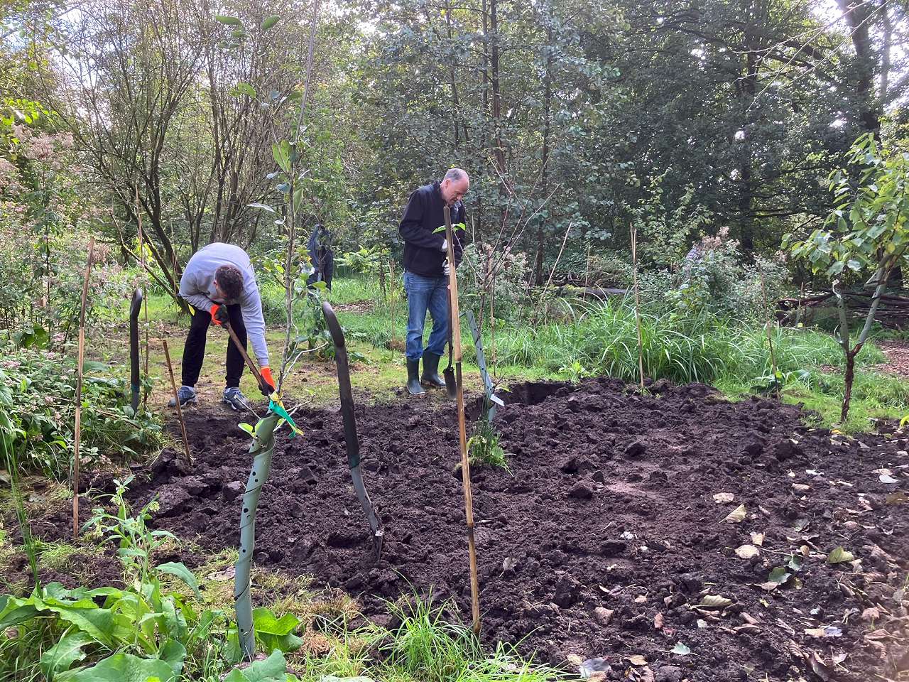 Donderdag 12 September zijn we weer een stuk verder gekomen met de aanleg van het Voedselbos. Op die dag hebben we hulp gehad van 5 Rabobankmedewerkers die een maatschappelijke dag hadden en die zich ingeschreven hadden voor spitten en sjouwen in het Voedselbos van Kasteel Geldrop.