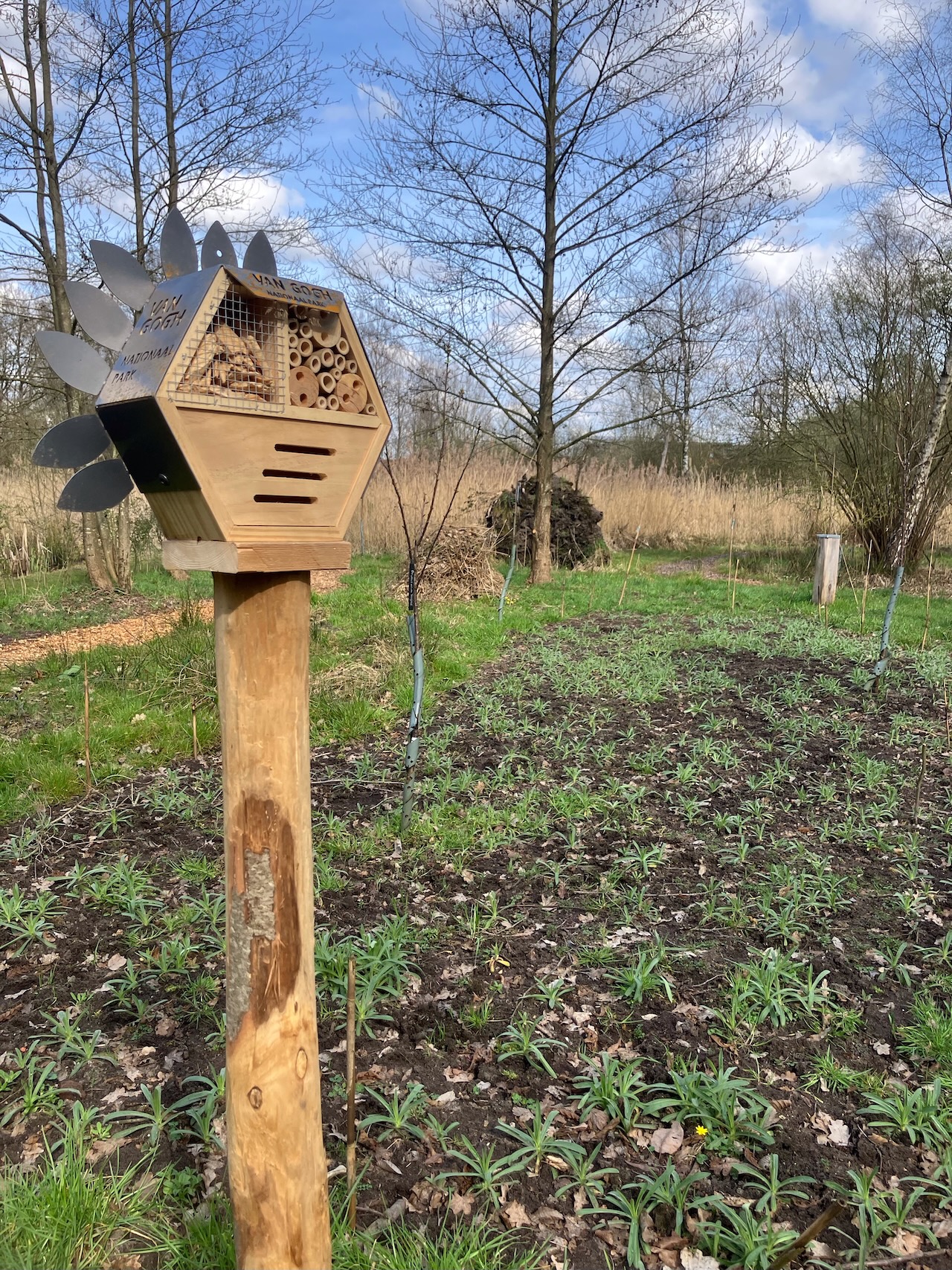 Het zaaigoed van de Cruydt-Hoeck komt mooi uit en (wordt nog niet opgegeten) en de geschonken insectenhotelletjes hebben hun plek gekregen (zie foto).
