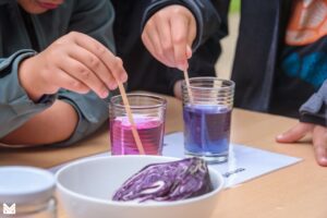 Bij het water werd een bijna echte ‘wetenschappelijke proef’ uitgevoerd. Met behulp van rode koolsap werd de zuurgraad bepaald van drie ‘watermonsters’: water uit een bosven, uit de gracht van het kasteel en uit de poel bij het voedselbos. Omdat er ook al een bakje klaar stond waarin te zien was wat azijn doet met een krijtje (het lost op) werd een link gelegd naar het huisje van de waterslakken en het water waar die slakken te vinden zijn. Quote: ‘het worden naaktslakken’.