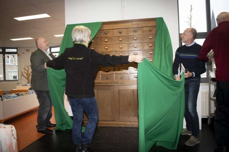 Na de woorden van de wethouder onthulden de drie sprekers samen de antieke ladenkast vol zakjes zaden op alfabet door het wegtrekken van een groot doek, groen natuurlijk!