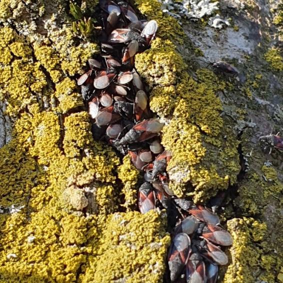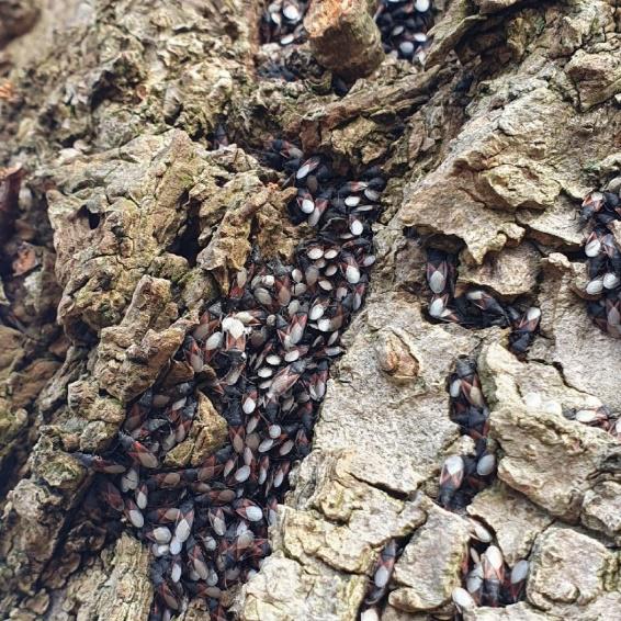 Over grote getalen gesproken. De foto links is gemaakt op Esp ook op een lindeboom. Op meerdere plekken op de boom zitten deze wantsen in groepen bij elkaar.