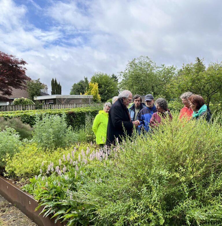 Ido en Loek gingen ieder met tien personen door de tuinen en gaven uitleg over de aanwezige planten en lichtten het gebruik hiervan toe.