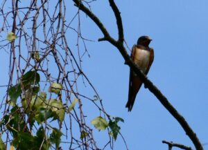 Ver hebben we niet gelopen, ongeveer 500 meter het gebied in, pad volgen en dan linksaf richting de poel. Maar we zagen heel veel klein spul, hihihihihi. Onder andere: zwart wekkertje, blauwbreedscheenjuffer, tengere pantserjuffer, gewone oeverlibel en een keizerlibel. Dat zijn de namen die een van de deelnemers in elk geval heeft opgeschreven. Enkele van deze insecten waren zo aardig als fotomodel te dienen. Ook zagen we nog een aantal boerenzwaluwen, scherend door de boomtoppen, op jacht naar insecten. Ze hadden ook rust nodig en daarvan heb ik het bewijs op foto.