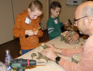 Tijdens onze Jeugd-IVN-activiteit zijn we creatief en leerzaam aan de slag gegaan met het maken van insectenvriendjes. Van de boomstammetjes die we tijdens de natuurwerkdag hadden gezaagd, maakten onze leden echte insectenhotels in de vorm van vrolijke figuurtjes. Dankzij het voorwerk van Mart – hartelijk dank daarvoor! – konden we meteen beginnen. De kinderen verbonden het hoofdje, de armen en de benen met houten plugjes. In de buik en in de armen en benen werden gaatjes geboord waarin insecten hun eitjes kunnen leggen. Dit gebeurde met boren van 6 en 8 mm, precies de juiste maat voor onze kleine insectenvrienden.