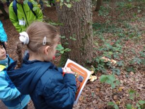 Tijdens de wandeling leerden we dat er verschillende soorten paddenstoelen zijn — opruimers, vriendjes en zelfs stoute paddenstoelen! We ontdekten ook dat sommige paddenstoelen plaatjes of gaatjes hebben aan de onderkant.