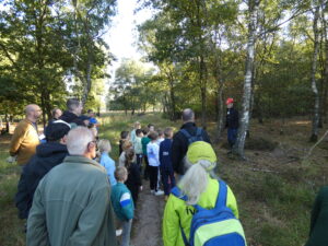 De jonge natuurliefhebbers gingen samen met hun ouders aan de slag met het zagen van boompjes die de heide overwoekeren. Van het zaagwerk werden vervolgens troshopen en broedhopen gemaakt: stapels takken en stammen die dienen als schuil- en nestplaats voor allerlei dieren. Er werd fanatiek gewerkt en regelmatig klonk het door het bos: “Van onderen!” als er weer een boompje omging. De kleinere boomstammetjes werden netjes opgestapeld — perfecte plekjes voor insecten en andere kleine dieren om zich in te verstoppen.