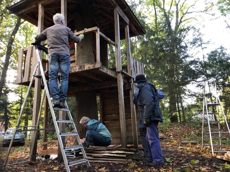 Leden van natuurvereniging IVN Grave zijn druk doende met het aanpassen van de boomhut in het belevingsbos op landgoed Mariëndaal.