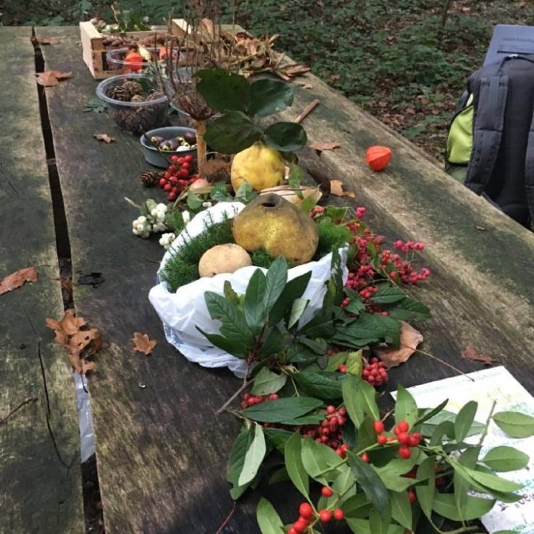 Daarna konden de kinderen een herfststukje maken in de wortels van een maisplant (ondersteboven). De schoolgidsen hadden daarvoor allerlei plantenmateriaal en vruchten verzameld. De kinderen vonden het prachtig.